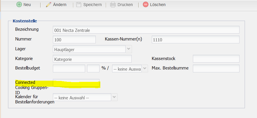 Für jede Kostenstelle kann im Menüpunkt Verwaltung->Kostenstellen->Kostenstellen eine Connected Cooking Gruppen-ID hinterlegt werden. Die Gruppen-ID wird beim Rollout der Garprogramme verwendet und schränkt die Gräte ein, für die ein Rollout in Connected Cooking erstellt wird.