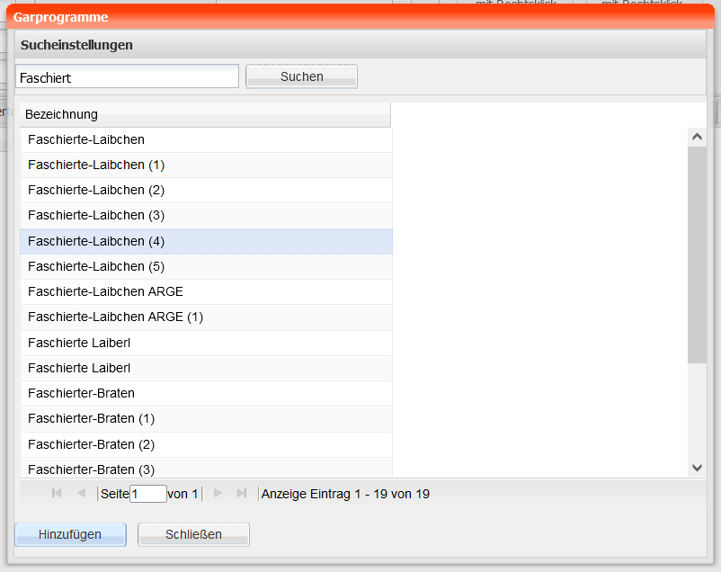 Durch markieren eine Ergebniszeile und betätigen der Schaltfläche "Hinzufügen" wird das Garprogramm zur Speise hinzugefügt.