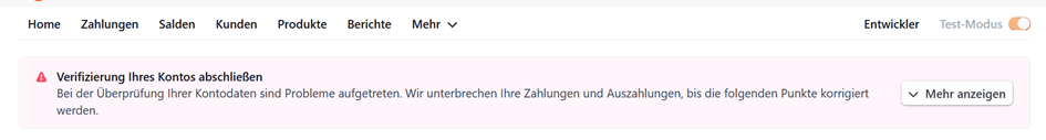 Im Falle, dass Stripe Fehler bei der Anbindung meldet, zeigt necta dies hier durch rote Warnmeldungen an. Verbinden Sie sich über den Button Zur Stripe Registrierung erneut zu Stripe, wo Ihnen der detaillierte Fehlerbericht angezeigt wird.