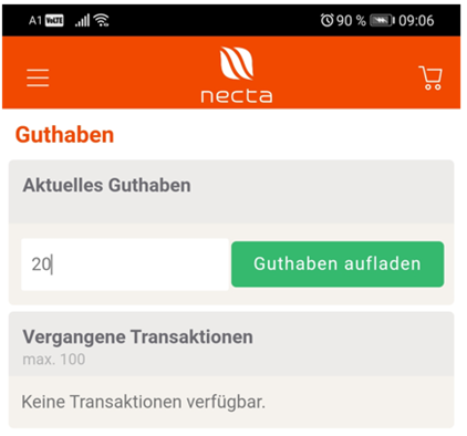 Bei Kunden mit dieser Einstellung wird in der mynecta-Bestell-APP ein zusätzlicher Menüpunkt Guthaben aufladen aktiviert.
