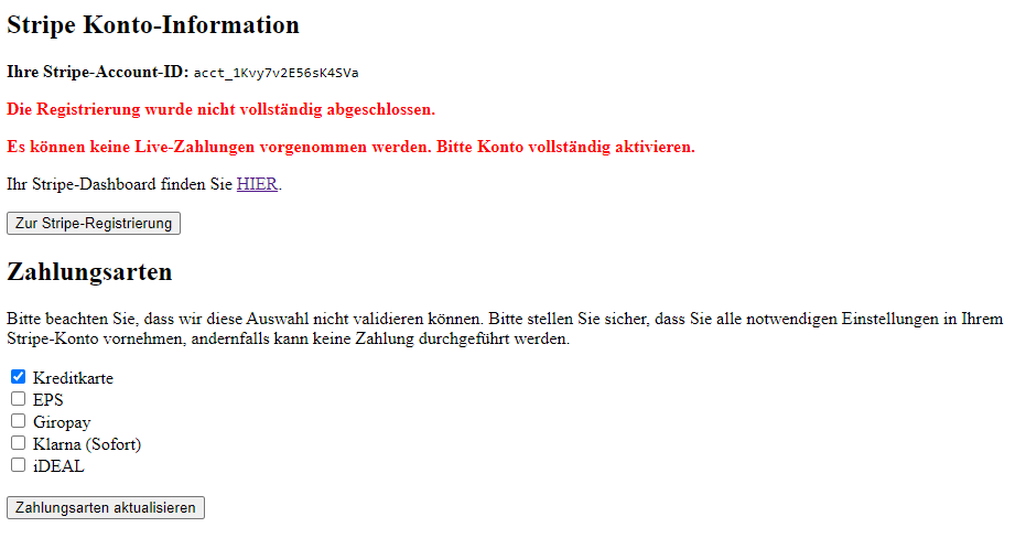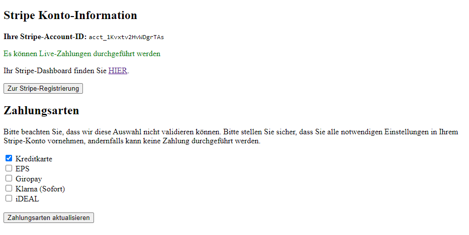 Im Zuge der Registrierung bei Stripe wird abgefragt, welche Zahlungsarten Sie Ihren Kunden anbieten möchten.