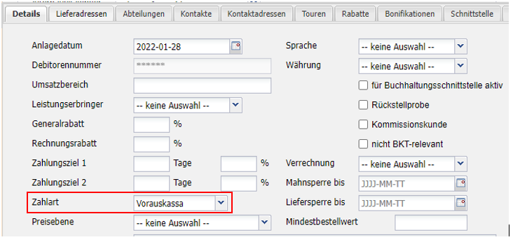 Um einen Kunden in necta für die Bezahlung via Onlinebezahlsystem freizuschalten, muss bei diesem Kunden im Menüpunkt Verwaltung - Kunden die Zahlart Vorauskasse hinterlegt werden.