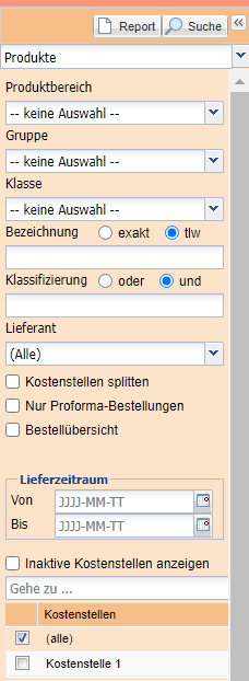 Inaktive Kostenstellen anzeigen Durch Setzen des Schalters werden auch Bestellungen von inaktiven Kostenstellen angezeigt.