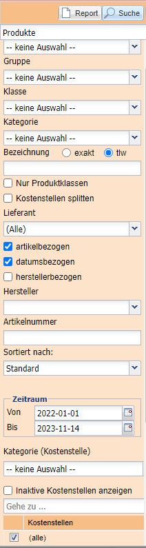 | Kostenstellen | Auswahl "aller" bzw. Mehrfachauswahl einzelner Kostenstellen möglich. |