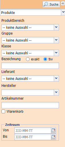 | Klasse | Auswahl der Produktklasse nach der gefiltert werden soll. |