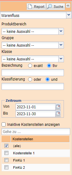 | Inaktive Kostenstellen anzeigen | Durch Setzen des Schalters werden auch Warenflüsse von inaktiven Kostenstellen angezeigt. |