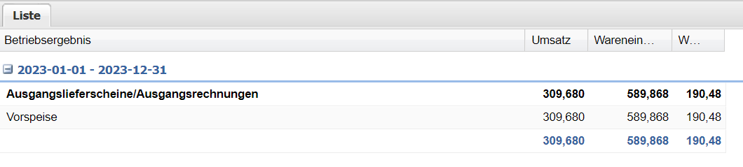 | Wareneinsatz | Anzeige des Wareneinsatzes in €. |