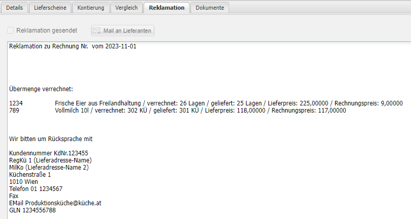 Mail an Lieferanten Durch Betätigen des Buttons wird eine E-Mail mit dem automatisch generierten Reklamationstext, an die beim Lieferanten hinterlegte "E-Mailadresse für Reklamationen" versendet.