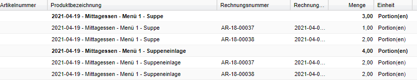 Wenn dieselben Produkte mehrmals in der Liste angezeigt werden, werden diese kumuliert und als Gruppenkopf fett geschrieben dargestellt.
