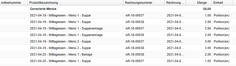 Summierung der Produkte nach Produktgruppen. Dargestellt werden diese fett geschrieben im Gruppenkopf. Produktgruppen sind z.B. Generierte Menüs (alle Produkte, welche über Wochenmenüpläne verkauft wurden), sowie die Produktklassen, der Produkte, welche über Verkaufslisten verkauft wurden.