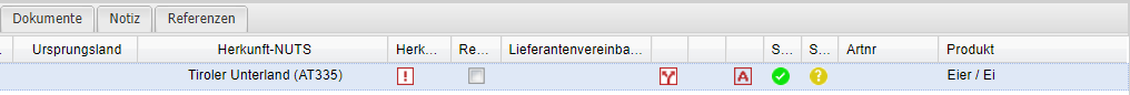 | Herkunftskontrolle erforderlich! | Ist das Rufzeichen-Icon ersichtlich, muss für dieses Produkt eine NUTS-Region eingetragen werden. Wird keine eingetragen, wird diese als "Herkunft unbekannt" interpretiert. |