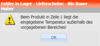 | Akz. | Ist die gemessene und hinterlegte Temperatur außerhalb des gültigen Wertebereichs kann diese durch Setzen des Schalters akzeptiert werden und der Lieferschein lässt sich Speichern. |