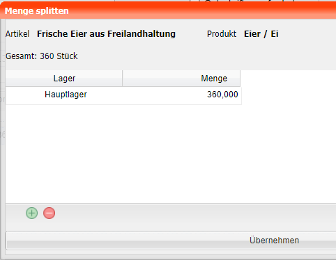 | Menge splitten | Durch Betätigen des Icons öffnet sich ein weiteres Fenster und es kann die Buchungsmenge auf mehrere Lager gesplittet werden. |
