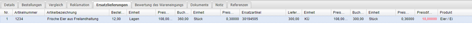 Anzeige der Preisdifferenz über die gelieferte Gesamtmenge des Ersatzartikels. |