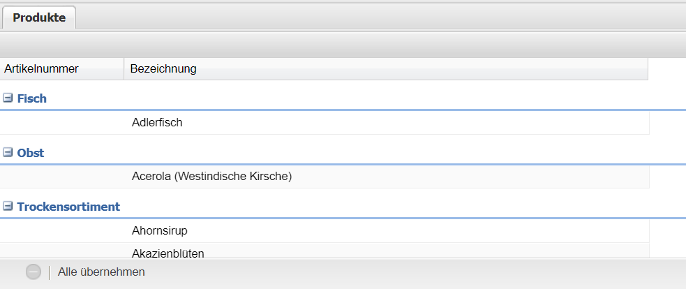 | Alle übernehmen | Durch Betätigen des Buttons werden alle im Suchergebnis gefunden Produkte in die Liste geladen. |