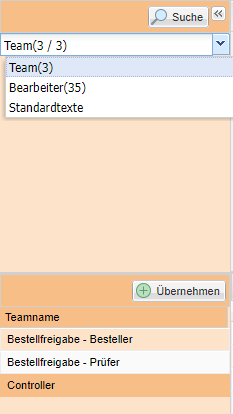 Über die Suchfunktion kann nach Teams und Bearbeitern gesucht werden und per Doppelklick bzw. Übernehmen-Button als Empfänger hinzugefügt werden.\ \