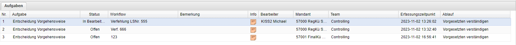 | Bearbeiter | Anzeige des Bearbeiters, der die Aufgabe übernommen bzw. bearbeitet hat. |