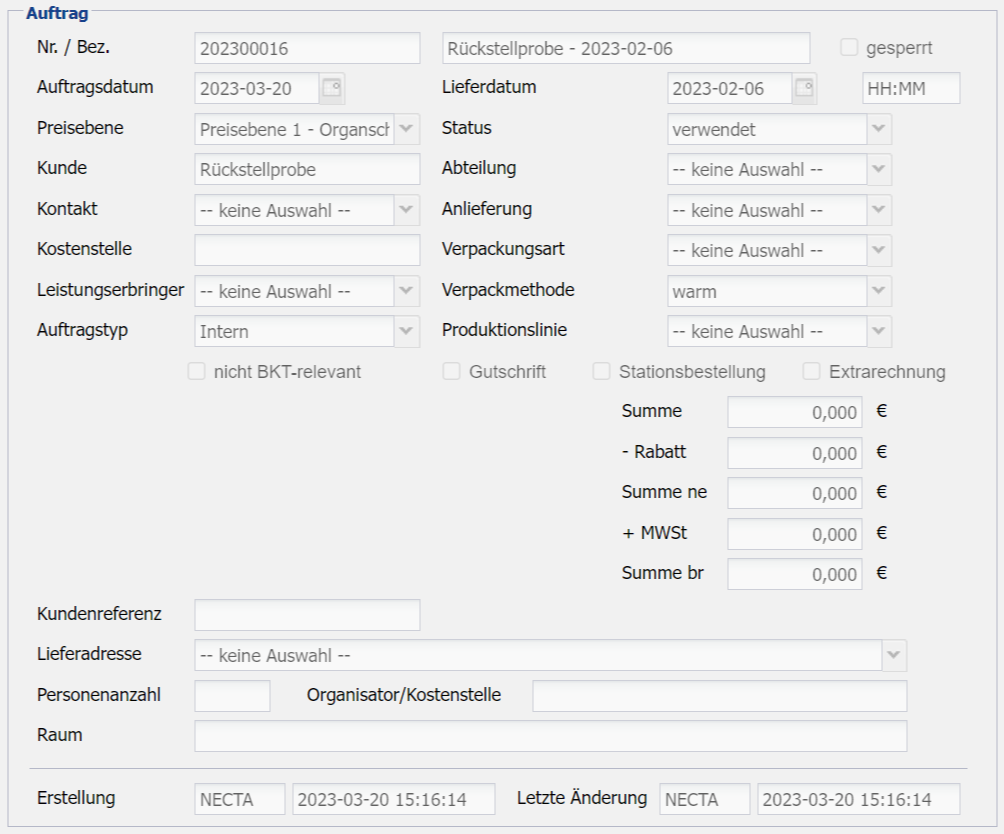| gesperrt | Ist der Schalter gesetzt kann der Auftrag nicht mehr bearbeitet bzw. gelöscht werden. Aufträge werden üblicherweise über von Partnersystemen über eine Schnittstelle gesperrt. |