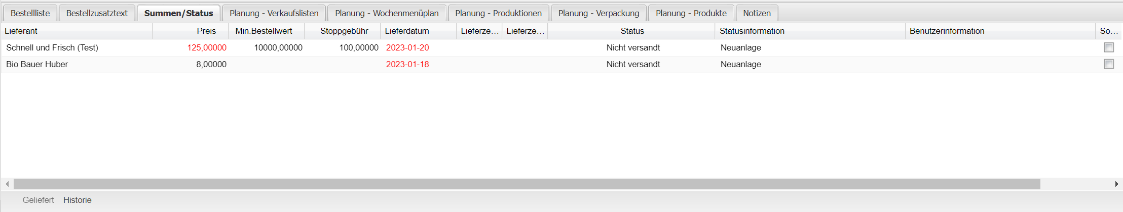 Lieferant Anzeige aller Lieferanten, welche Lieferantenartikel in der Bestellung verknüpft haben. Ein Lieferant kann mehrmals vorkommen, insofern mehrere Liefertage in der Bestellung vorkommen.