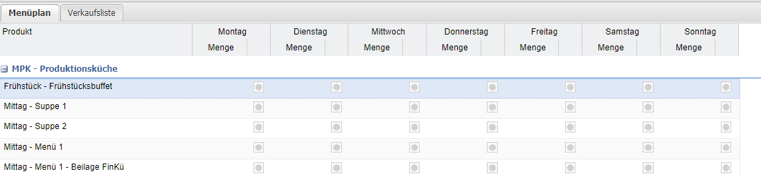 | Mengen Montag - Sonntag | Hinterlegen der Musterauftragsmengen je Wochentag und je Verpflegsart. |