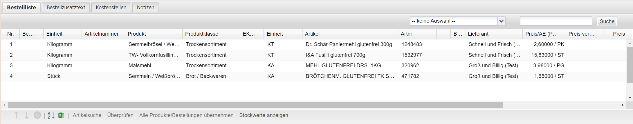 | Suche | In der Mitte des Bildschirms an der rechten Seite kann man innerhalb der Bestellliste nach Produktklassen filtern bzw. nach einzelnen Produkten suchen. |