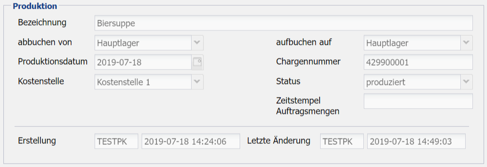 Produktionsdatum Auswahl des Produktionsdatums. Sämtliche aus der Produktion ausgelösten Lagerbewegungen erhalten ebenfalls dieses Datum.
