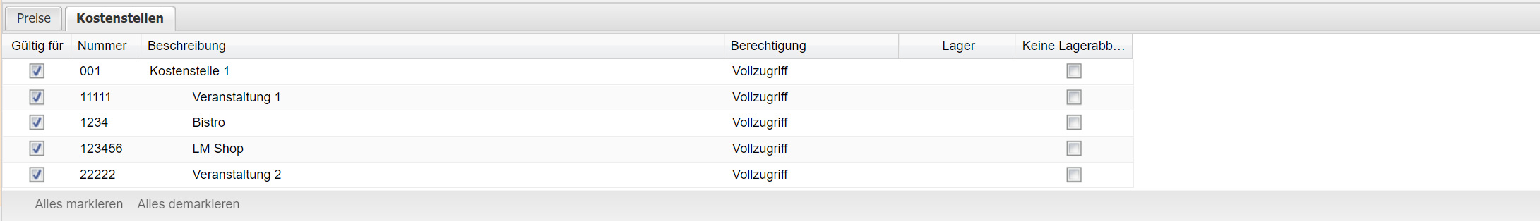 - Vollzugriff (die Veranstaltung darf in dieser Kostenstelle geändert und gelöscht werden)