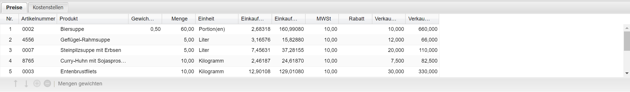 Mengen gewichten Durch Betätigen des Buttons werden die Mengen auf Basis der eingegebenen Gewichtungen und der Personenzahl neu berechnet.