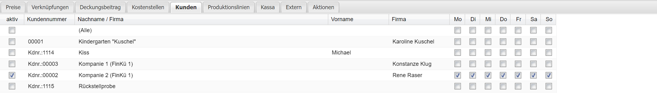 aktiv Durch Setzen des Schalters ist die Verkaufsliste für den Kunden gültig geschalten und sowohl Menüvorbestellung als auch Aufträge können für den Kunden angelegt werden.