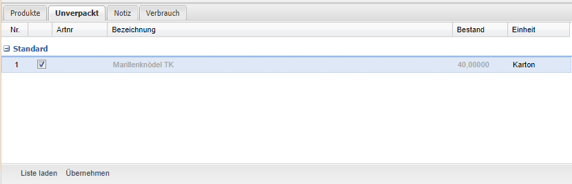 | Liste laden | Durch Betätigen des Buttons werden sämtliche Lieferprodukte in die Liste geladen, die einen positiven Lagerbestand auf dem im Header ausgewählten Zwischenlager haben. |
