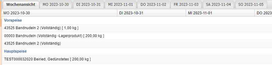 Übersicht sämtlicher in dieser Woche zu produzierenden Produkten, samt der Produktionsmengen in den eckigen Klammern [ ].