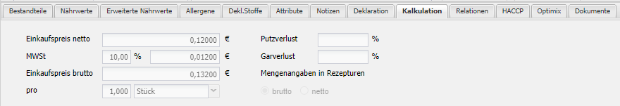 | Mengenangaben in Rezepturen | brutto: Ist bei Mengenangaben in Grundprodukten „brutto“ eingestellt, wird der Putzverlust in Prozent nur für die Nährwerte errechnet.