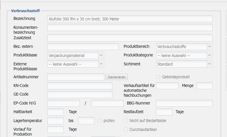 | Produktbereich | Auswahl eines Produktbereichs mittels Dropdown-Liste, in welchem Produktbereich der Verbrauchsstoff gespeichert werden soll |