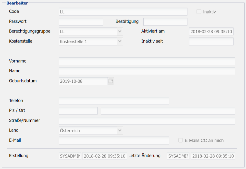 | Inaktiv | Durch Setzen des Schalters wird der Bearbeiter deaktiviert und ein Login ist nicht mehr möglich |