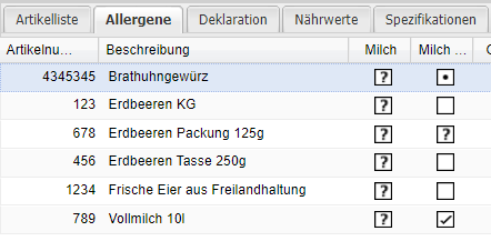 Je Allergen gibt es zwei Spalten. Die linke Spalte ist jene, welche mit den Daten des Lieferanten befüllt wird. Die rechte Spalte ist jene, welche der Bearbeiter selbständig bearbeiten kann. Standardmäßig befinden sich in der rechten Spalte, dieselben Allergeninformationen, wie jene aus der linken Spalte. Sollte ein Bearbeiter die Allergeninformationen selbst hinterlegen und in der rechten (eingegebenen) Spalte etwas bearbeiten, dann werden diese Änderungen in sämtliche Strukturen in necta bei einer LMIV-Datenübernahme nachgeführt.