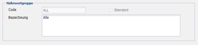 | Code | Die Nährwertgruppen werden mittels Suchbefehl mit Suchkriterien aufgelistet und können mit Doppelklick übernommen werden. An dieser Stelle wird dann Code und Bezeichnung der gewählten Nährwertgruppe angezeigt (änderbar). |