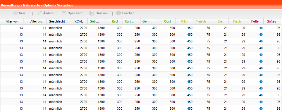 KCAL Anzeige der optimalen KCAL je Alter und Geschlecht.