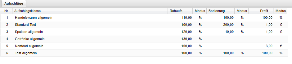 Aufschlagsklassen können bei Verkaufsprodukten hinterlegt werden und mit deren Hilfe ein kalkulierter Verkaufspreis auf Basis des WES berechnet werden. Neben den Standardaufschlagsklassen (Handelswaren allgemein, Speisen allgemein, Getränke allgemein, Menüs allgemein, Non-Food allgemein und Lieferprodukte allgemein) können beliebig viele Aufschlagsklasse hinzugefügt werden und je Kostenstelle freigeschaltet werden.