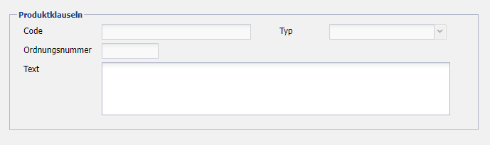 Jede Produktklausel muss einem Typ zugeordnet sein, muss einen eindeutigen internen Code haben und wird mit einem Standardtext belegt, welcher dann auf diversen Drucken verwendet wird.\