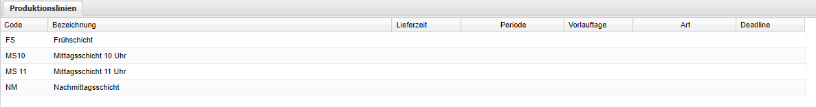 Produktionslinien dienen u.a. dazu, um mehrere Aufträge für einen Verzehrtag je Verpflegsklasse (z.B. Frühstück, Mittag und Abend) zu erstellen bzw. um Bestelldeadlines je Lieferzeit / Produktionslinie zu hinterlegen.