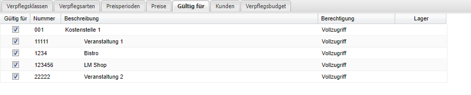 | Gültig für | Durch Setzen des Schalters ist die Menüplanklasse für die Subkostenstelle gültig. |