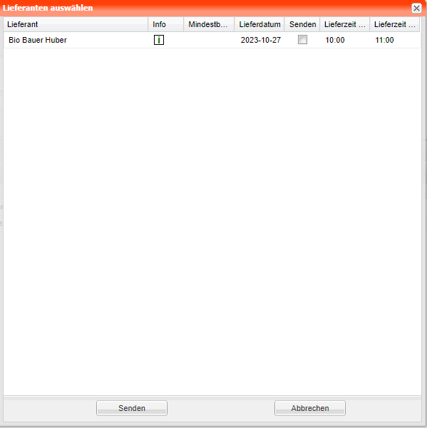 Wenn man nun den Button "Senden" drückt, wird die Bestellung an den Lieferanten übermittelt. Es werden nur Bestellungen zu Lieferanten übermittelt, bei denen ein Häkchen gesetzt ist!