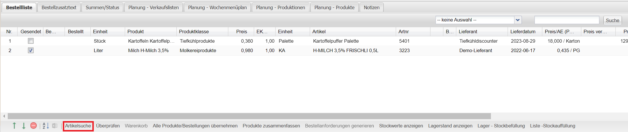 Die "Artikelsuche" wird u.a. dafür verwendet, die Einkaufsartikel bei den diversen Lieferanten zu suchen und der Musterbestellung hinzuzufügen.