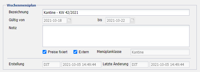 Abhängig von der Einstellung brutto oder netto bei der Preisperiode in der Menüplanklasse ist entweder nur der Brutto- oder nur der Nettoverkaufspreis editierbar.