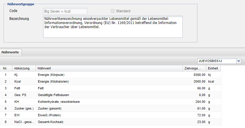 Zur Ausweisung von Nährwerten innerhalb der SW sowie auf ggf. benötigten Ausdrucken, wurde die Nährwertgruppe „Big Seven + kcal“ für alle Bearbeiter des Mandanten als Standard voreingestellt.