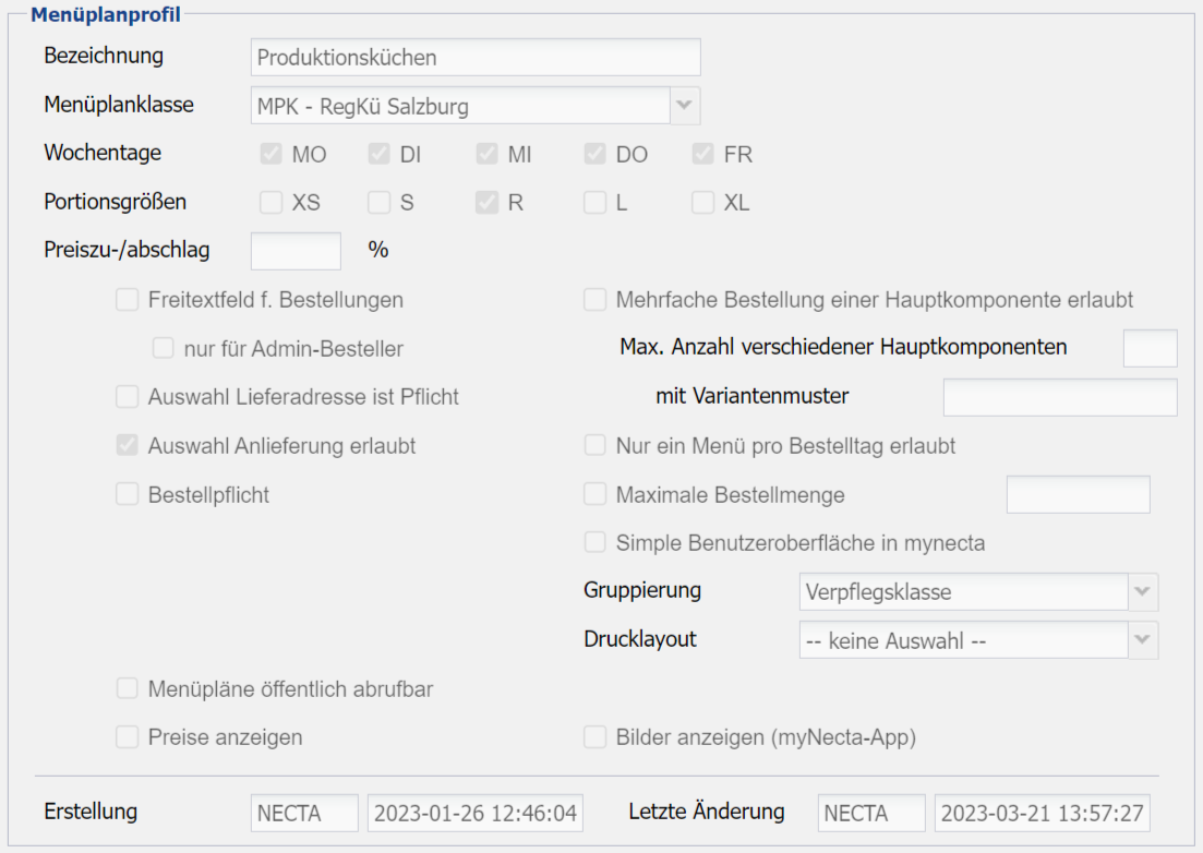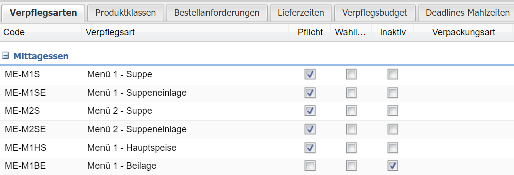 Per Häkchen in der rechten Spalte legt man fest, welche Bestellanforderungen in dem Menüplanprofil aktiv sind.