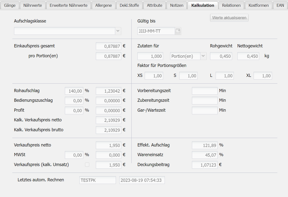 An dieser Stelle kann auch die gewünschte Aufschlagsklasse hinterlegt bzw. der Verkaufspreis angepasst werden. Weitere Informationen zur Kalkulation finden Sie unter Speisen - Kalkulation.