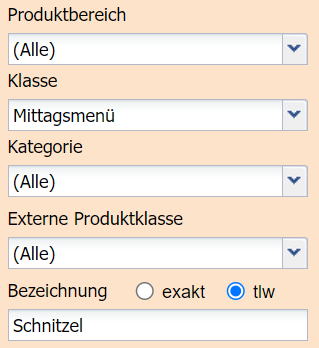 An dieser Stelle kann über verschiedene Filtermöglichkeiten nach den Gängen (Speisen) gesucht werden. In diesem Fall wurde der Produktbereich "(Alle)", die Produktklasse "Mittagsmenü" und die Bezeichnung "Schnitzel" gewählt.