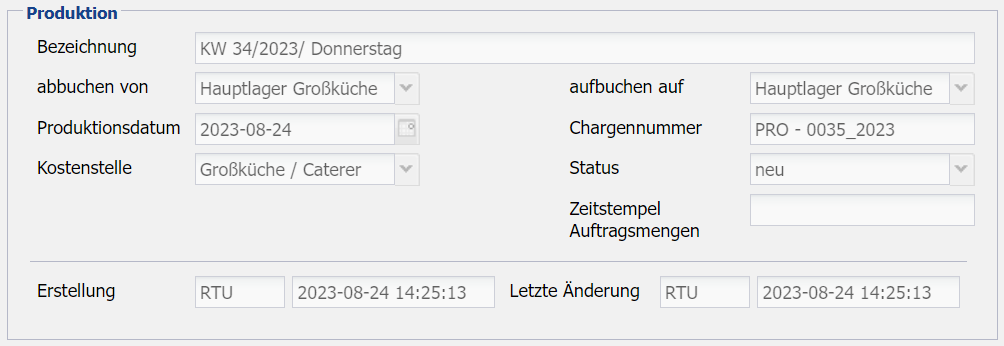 Hier muss eine Bezeichnung für die Produktion hinterlegt werden. Es empfiehlt sich entweder das Produktionsdatum einzutragen oder auch das Verzehrdatum (kann bei z.B. Cook & Chill natürlich abweichen)