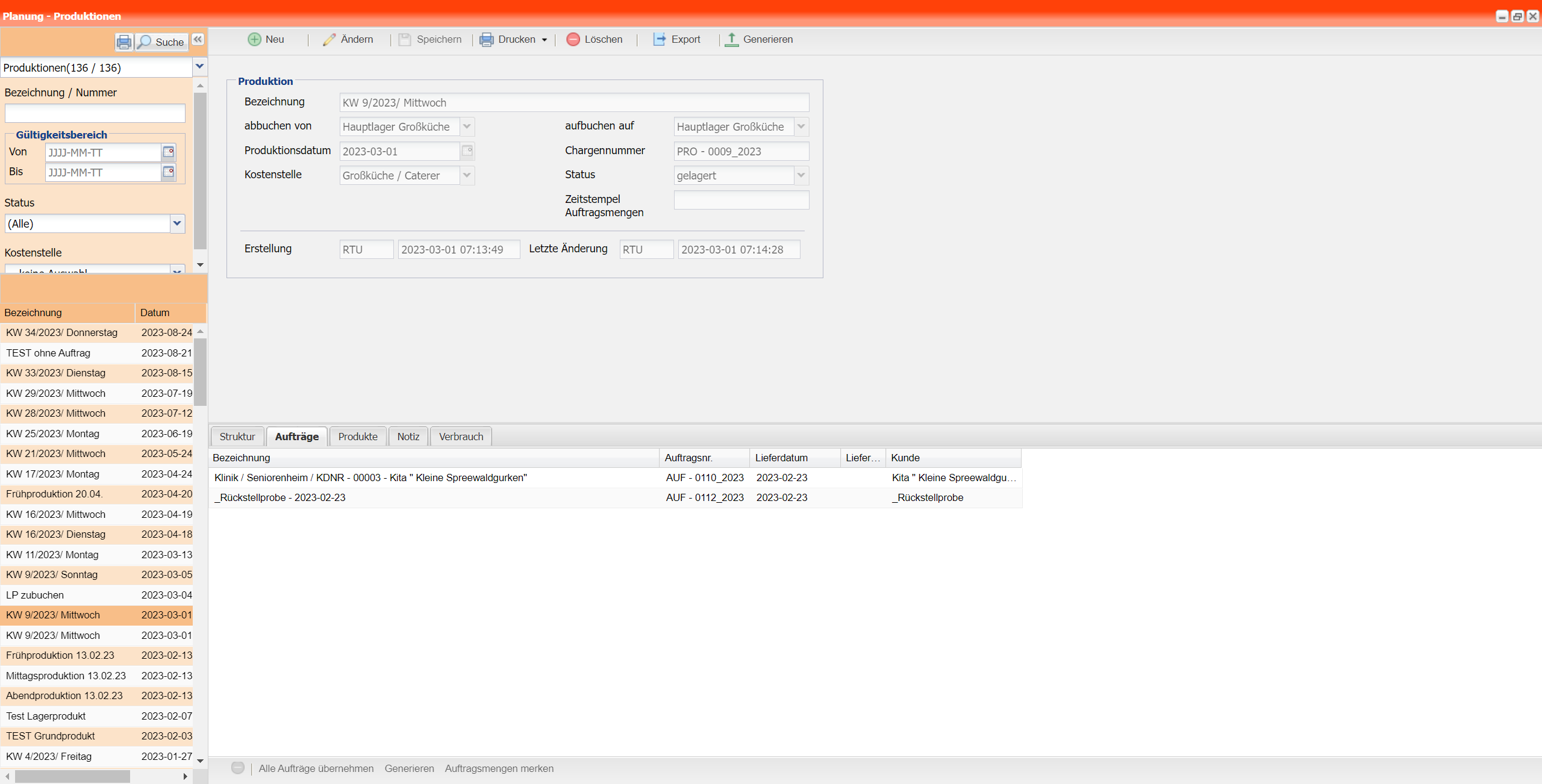 Nachdem alle gewünschten Aufträge hinzugefügt wurden, müssen diese generiert bzw. berechnet werden. Hier werden alle Produkte aus den Aufrägen zusammengerechnet und summiert bzw. der Bedarf / Verbrauch an Grundprodukten errechnet.